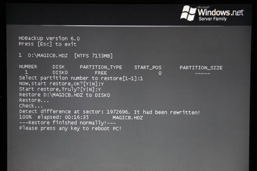 事前に、HD革命back upで用意しておいたブータブルCDで、RAID0でリカバリーしてみた。しかし、これは時間がかかる。BIOSでのRAID構成と、F6RAIDドライバーを入れる以外は、ほとんど手がかからないが、今回sectorのrewriteが一回あったので長かった。所要時間は約1時間。Rewriteがなければ、30分程度。リカバリー後は元に戻る。