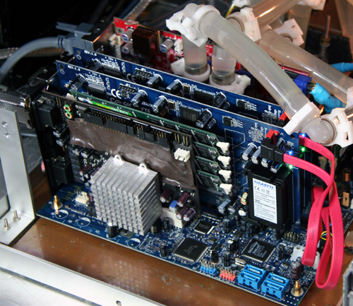 Asus A8N SLI DeluxeにはPCIスロットが3つある。i-RAM2本とサウンドカードですべて埋まる。i-RAMの幅は挿すメモリーによる。CORSAIR/VS1GB400C3を使用すると、1スロットよりも数ミリ大きくなる。写真では綺麗にインストールできているように見えるが、両端のi-RAMは、若干傾いている。排熱も悪そう。i-RAMのSATA端子はマザーのSATA1と2に繋いだ。