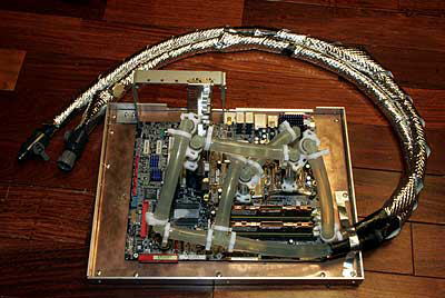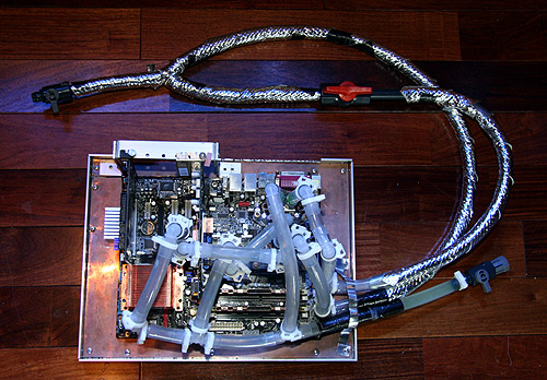 マザーボードケースを取り出した写真。Eheimのダブルタップを利用して、水漏れなしに、水冷システムから切り離すことができる。 |