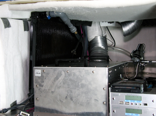 車両用ラジエターを設置した様子。水冷経路内に直列に挿入。エアコンの冷気で冷却する。前面パネルをはずした瞬間、マザーボードケース表面が、うっすら結露する。