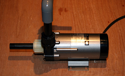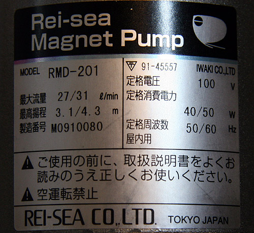 モーターを変更した。現在のものでも十分とは思うが、CPUヘッドなどへの水流を落としたくない。この種のポンプは、水槽用途で、稼働中のものが20、使っていないものが常時10個ほどある。緊急用、交換用、部品取り用など。ポンプが止まると、生物に甚大なダメージがある。今回はその中から比較的小さいものを採用した。PC内のシールが、かなりルーズなので、出力の大きいものを使用すると、高い水圧で水漏れを起こす恐れがある。Rei-Sea RMD-201を使用した。50ワットで揚高4.3m。5年ほど前に購入した。