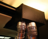 空冷は必要だ。発熱部分は他にもあり、やはり熱がこもる。通常はPC内にファンがある。しかし、ファンは置きたくない。これは電気的ノイズも発生するという。音声再生もノイズに敏感なシステムを使用しているので、ファンは精神衛生上も良くない。また循環温度をかなり下げるので、エアーの温度が高いと意味がない。少なくともクーラーの設定温度に近い必要がある。そこで冬は換気扇から外気、夏はエアコンの送気を直接取り込む工作を行った。冷却水の設定温度はエアーの温度マイナス5度くらいだとトラブルなく動作する。ケースの断熱が必須だ。