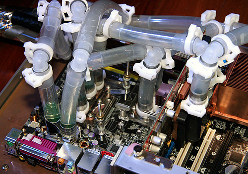 マザーボードケースのカバーをはずしたところ。水冷ホースは1/2インチ。CPU, NorthChip, VGAを冷却。その後HDD, 電源へと引き回している。