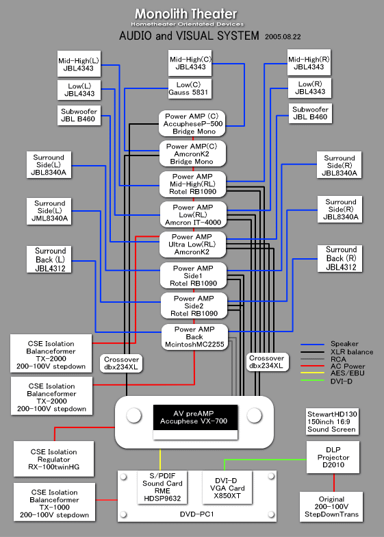 プリアンプからのフロント左右のキャノン出力を、チャンネルデバイダーdbx234XLで高域、低域、超低域に分けて、3つのステレオパワーアンプに入力した。フルバランス接続。パワーの高域はRotel RB1090,低域はAmcron I-T4000, 超低域はAmcronK2に入力した。強力な駆動力と制動力を持つパワーアンプ3つでマルチドライブすることになる。ぞれぞれマックスパワー、ダンピングファクター共に強力な数値を持っている。