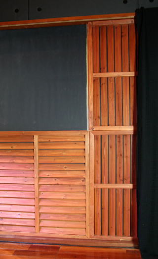 壁面を構成する拡散板の更にその手前には、可動式の大型のトレリスを利用して、音質を調整できるようにした。二重の拡散板だ。これは、ふすまのように移動できる。裏には鉛遮音シートを貼って、防振している(右写真)。この拡散板の底面には、車輪を取り付けている。取り付けるためのくり貫きは、板が柔らかいのでそう難しくはない(下写真)。反射板の向きが違うものを2枚ずつ、計4枚作成した。これを適当に移動すると、音質が結構変化する。黒いカーテンで覆うと、この構造そのものも見えない。