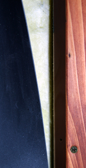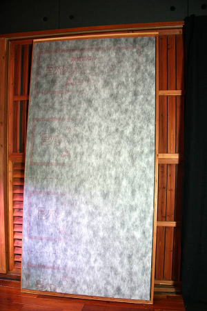 左の写真は、拡散板を一枚はずしたところ。4本のコーススレッドで固定しているだけなので、取り外しは簡単だ。奥には鉛入りの遮音シート、またその裏にはグラスウールの吸音材を敷き詰めた(右写真)。30畳の長軸方向10mの両サイド分なので、厖大な量の鉛シートと吸音材を購入した。製作は自分一人で、約1週間かかった。コンクリート面への固定は、木の荒材を大量に購入し下地固定枠を作成、コンクリートビスで固定し、そこにトレリスを固定している。軽鉄でないところもミソ。軽鉄は鳴く。