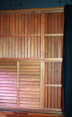 究極のデッドにするのも気が引けたので、音の反射・拡散面は自作した。木の鳴きを心配したが、固有の響きは特にないようだ。定在波の減弱にも役立っていると思う。拡散の度合いを調整できるので、結構楽しめる。聴感上、中高域の反射量が多いが、拡散板の向きを変えると高域も減衰する。データは取ってない。